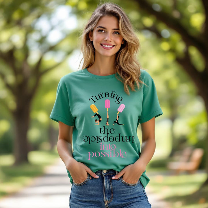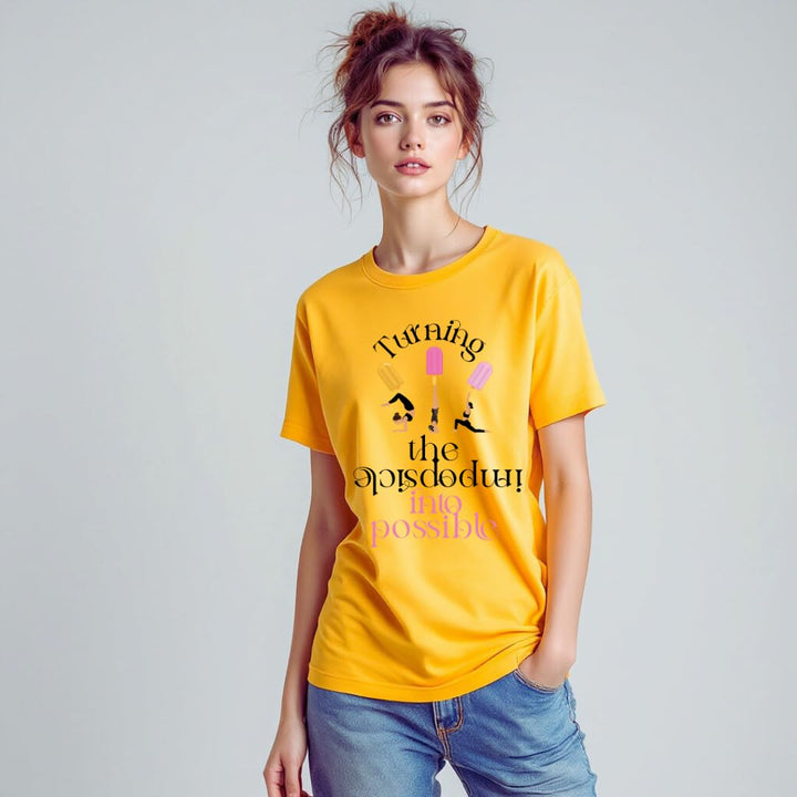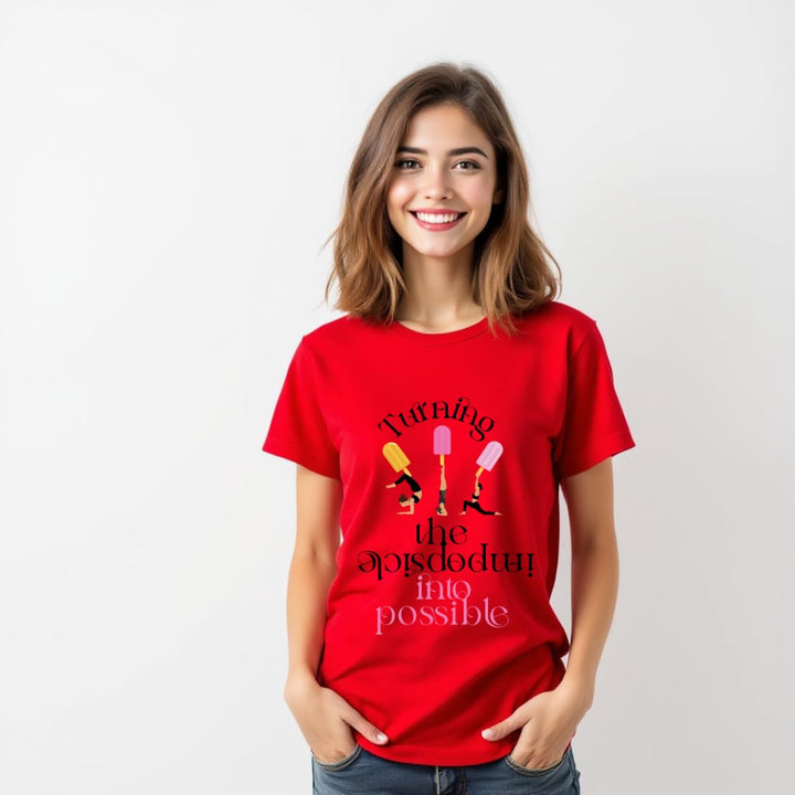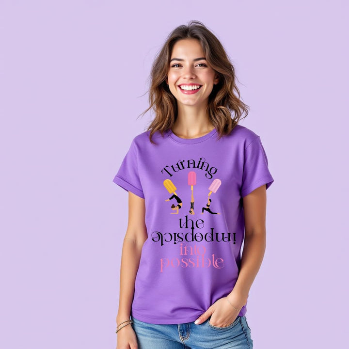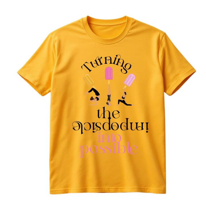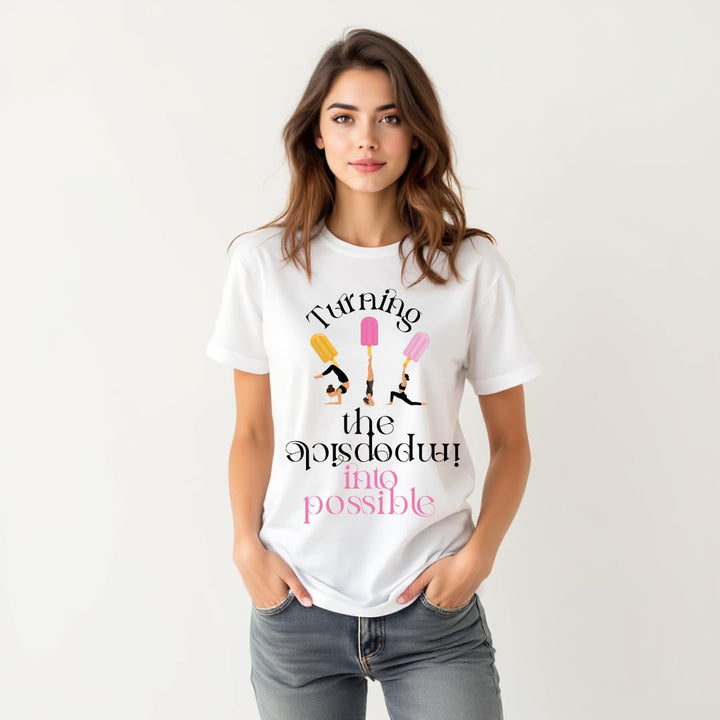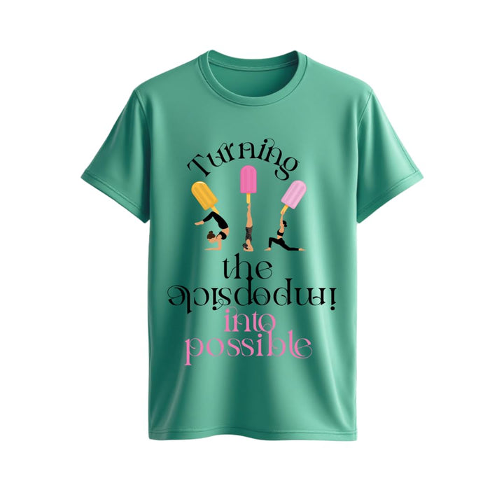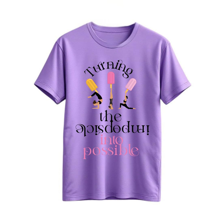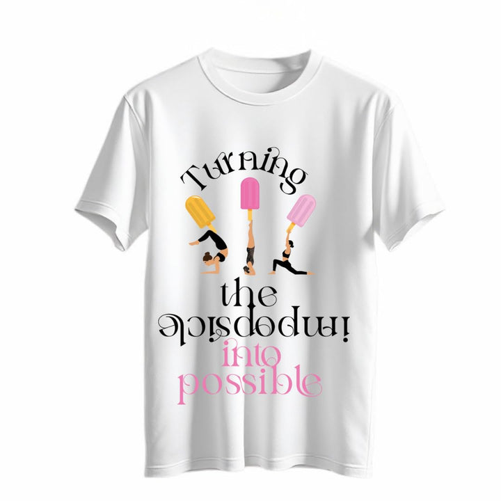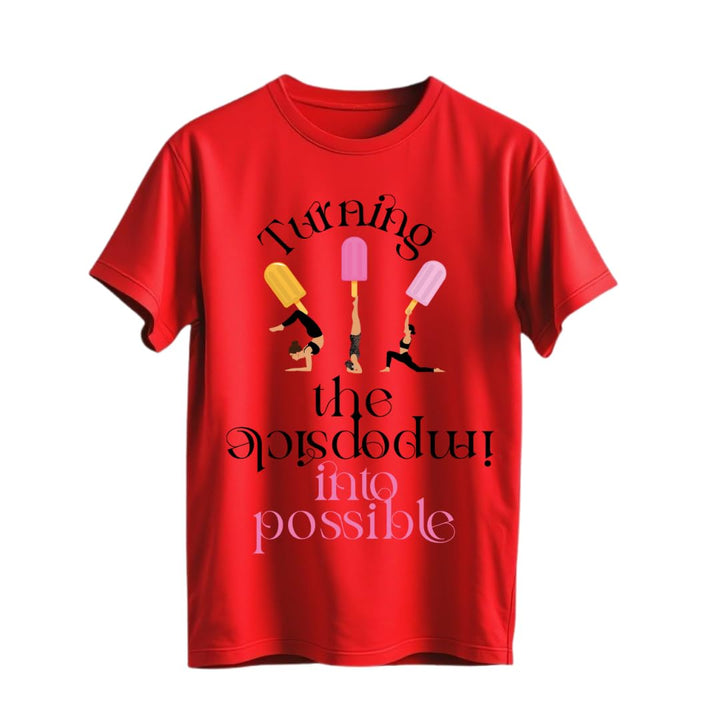 Embrace positivity and determination with this unisex cotton t-shirt featuring the inspirational quote: "Turning the Impossible into Possible." Designed with yoga and fitness enthusiasts in mind, this half-sleeve, round-neck t-shirt is perfect for casual wear, workouts, or lounging. Made from soft and breathable cotton, it ensures all-day comfort and durability. Its unique design, incorporating yoga poses and vibrant popsicle graphics, adds a fun yet motivating touch to your wardrobe. An ideal gift for friends, family, or anyone seeking inspiration.