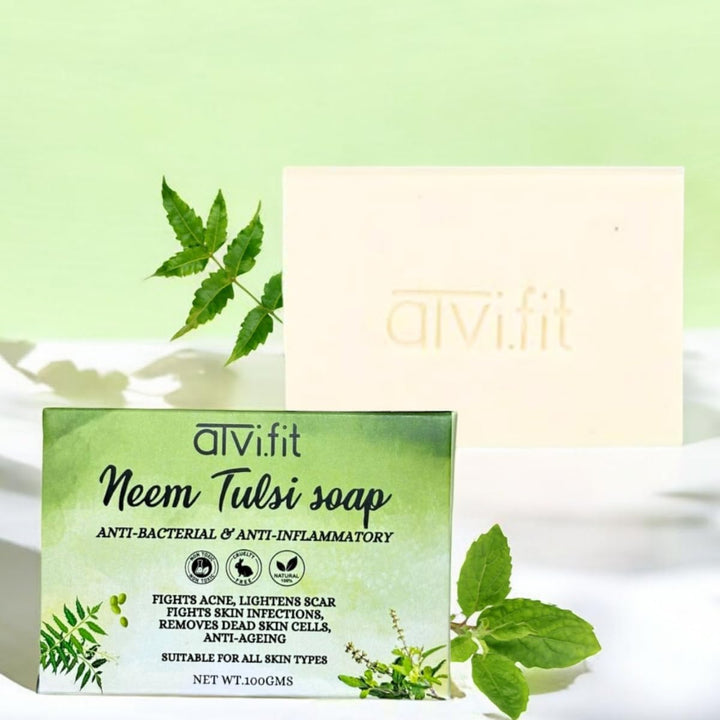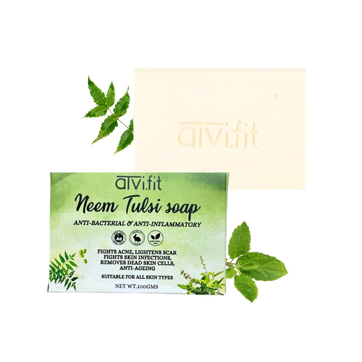 Includes Natural Loofah: Gently exfoliates dead skin cells, unclogs pores, and enhances cleansing. Prevents Skin Infections: Controls bacteria and fungal breakouts with daily use. Chemical-Free & Safe: Handmade with herbal ingredients – free from parabens, sulfates, and synthetic fragrances. Anti-Ageing Benefits: Supports youthful skin by improving texture and reducing fine lines. Face & Body Use: Safe for all skin types – ideal for both men and women. Ayurveda-Inspired Skincare: Combines traditional Indian herbs with natural exfoliation for a complete skin detox Atvi.fit neem tulsi soap Anti-bacterial & Anti-inflammatory soap enriched with clove oil, tulsi (sacred basil) oil, dried neem and tulsi powder. This is an amazing soap for people suffering with skin ailments psoriasis, eczema, and dermatitis. The antioxidants in...
