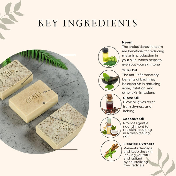 Atvi.fit neem tulsi soap Anti-bacterial & Anti-inflammatory soap enriched with clove oil, tulsi (sacred basil) oil, dried neem and tulsi powder. This is an amazing soap for people suffering with skin ailments psoriasis, eczema, and dermatitis. The antioxidants in neem are beneficial for reducing melanin production in your skin, which helps to even out your skin tone.This is a handmade soap and contains no added harmful fragrances and chemicals. Clove oil gives relief from dryness and itching